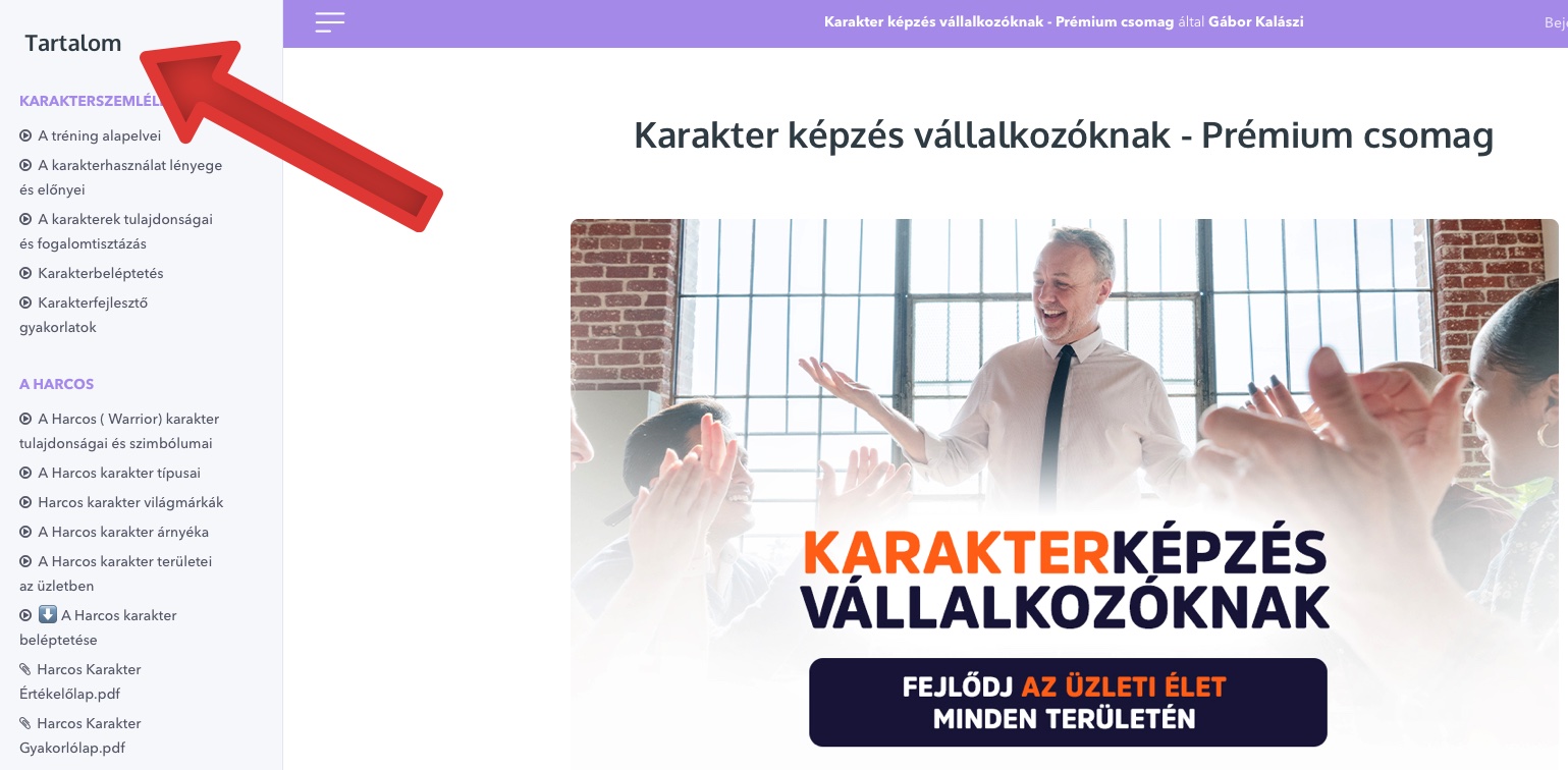Egy bizonyos terméken belül mindig a képernyő bal oldalán találod a kurzus teljes, görgethető tartalomjegyzékét, "Tartalom" címszó alatt. Ez egy élő tartalomjegyzék, amelynek ha bármely címsorára rákattintasz, akkor középen megjelenik a címsorhoz tartozó oktatási tartalom.